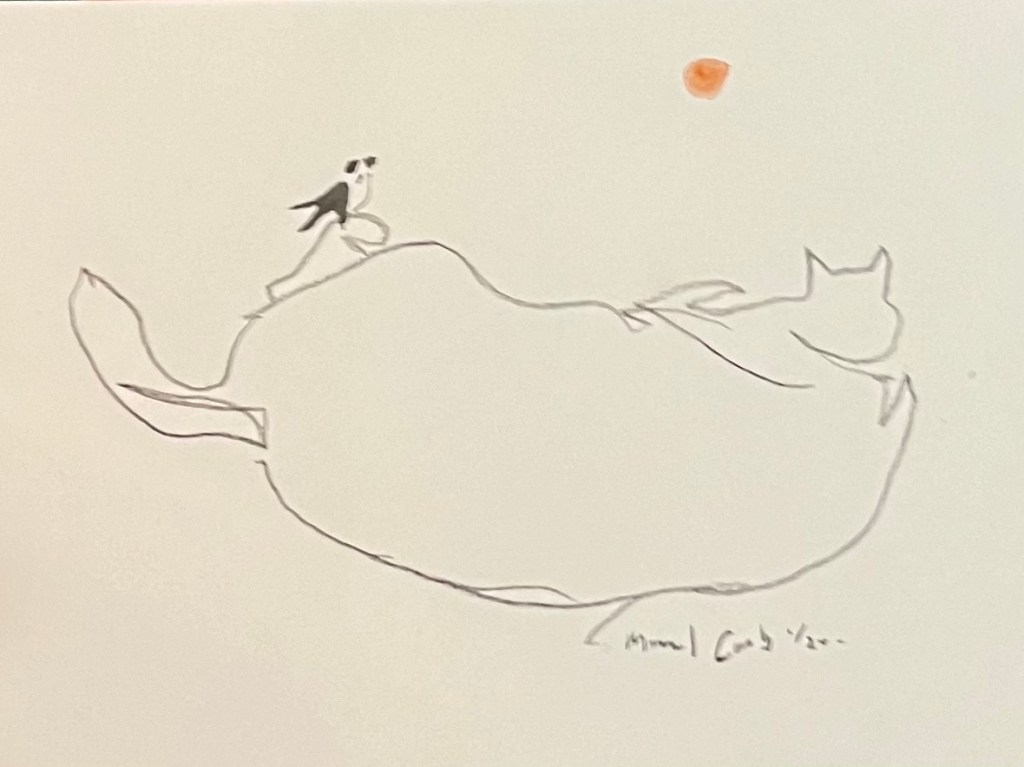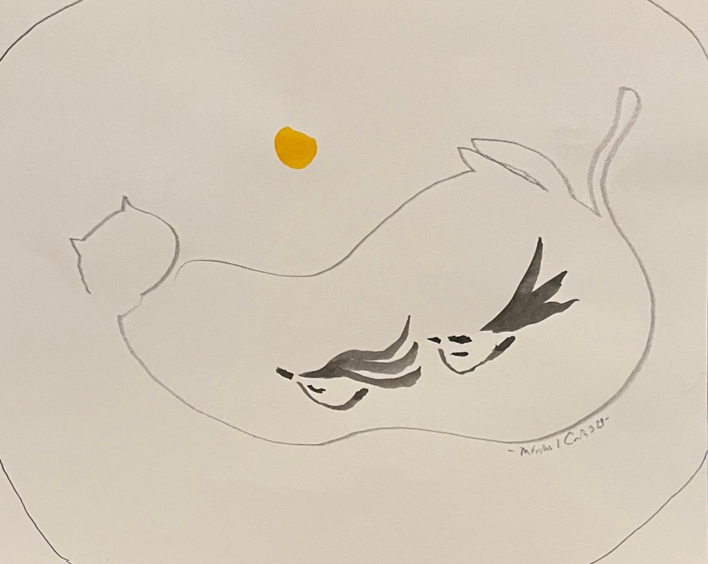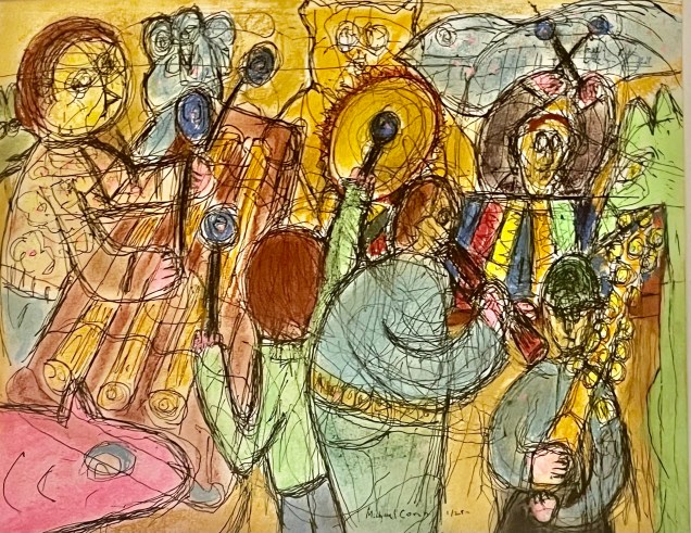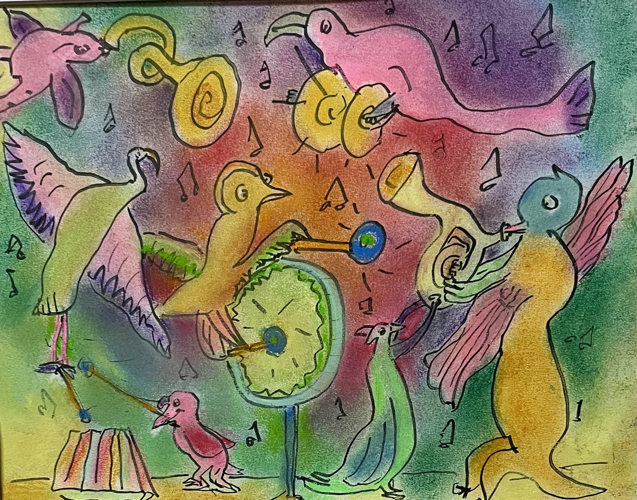The title of the third image is “Jazzy Birds” I drew and combined my own version from “A Coloring Book of Ancient Egypt.” by Bellerophon Books, 2000. I drew it in pen, then added pastel color. The composition is very active and dynamic, and the blended colors make the birds glow. I can hear the jazzy music.