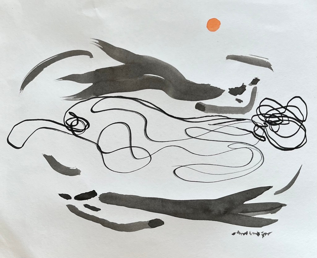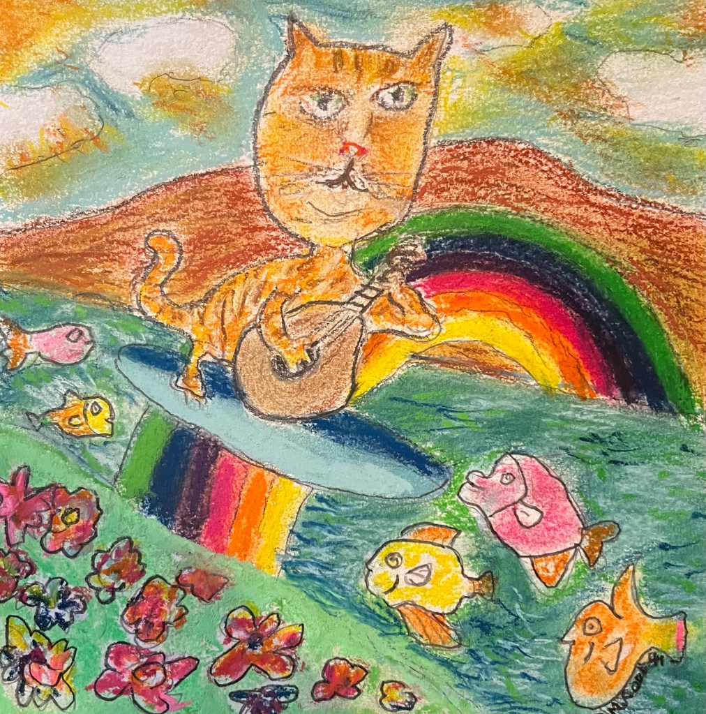 The instruments in this painting were drawn from small instruments in my music box. The characters were drawn from my imagination. I used a pen, then painted with watercolor, then used pen again. The all over chaotic lines complement the title of the story, “All Together Now”, taken from a Beatles’s song.