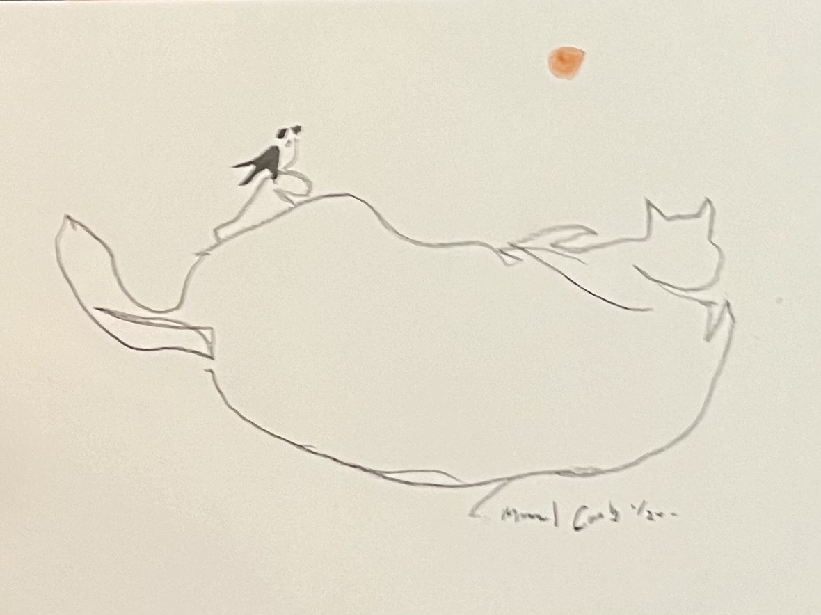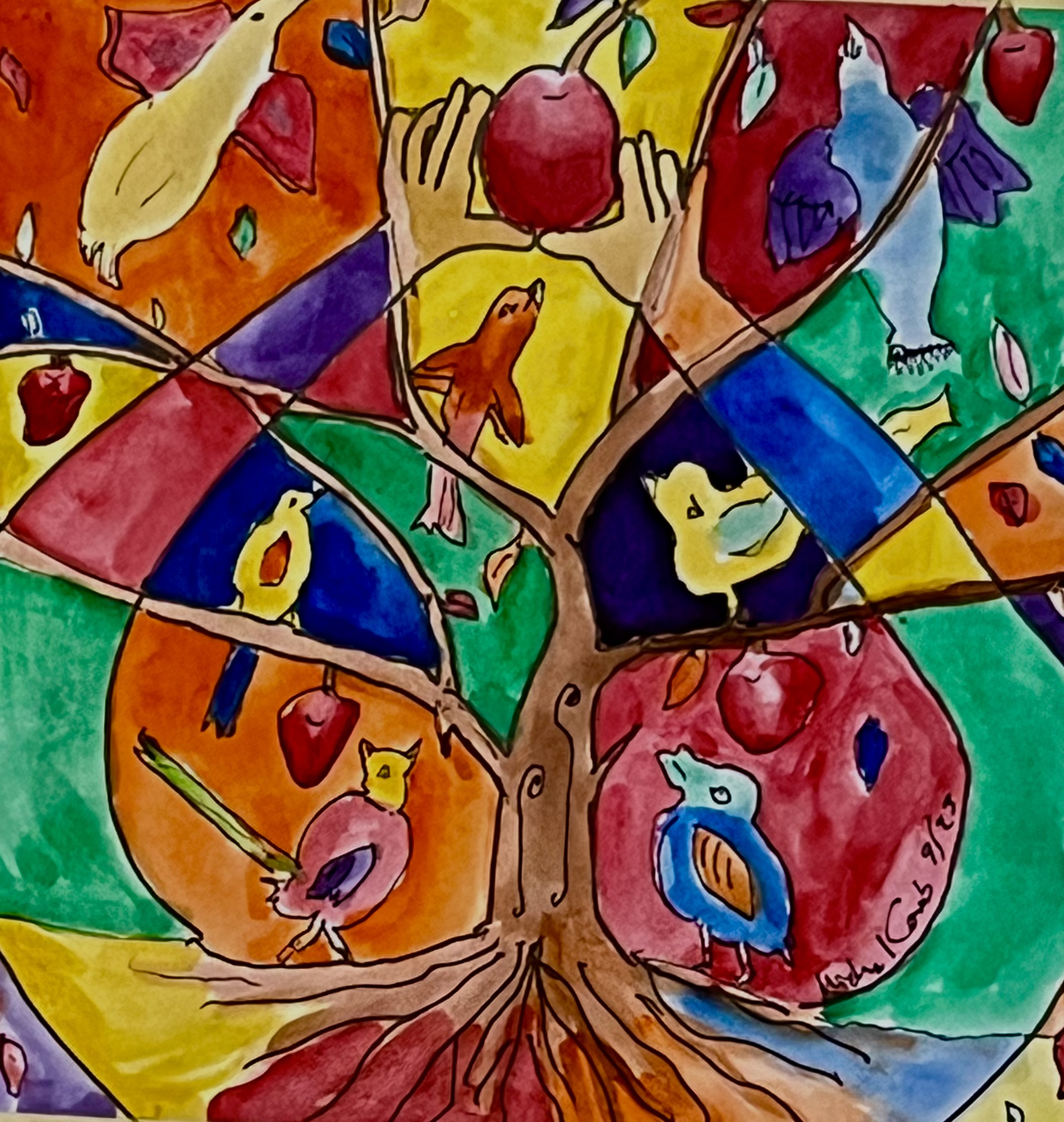 The title of the third image is “Jazzy Birds” I drew and combined my own version from “A Coloring Book of Ancient Egypt.” by Bellerophon Books, 2000. I drew it in pen, then added pastel color. The composition is very active and dynamic, and the blended colors make the birds glow. I can hear the jazzy music.