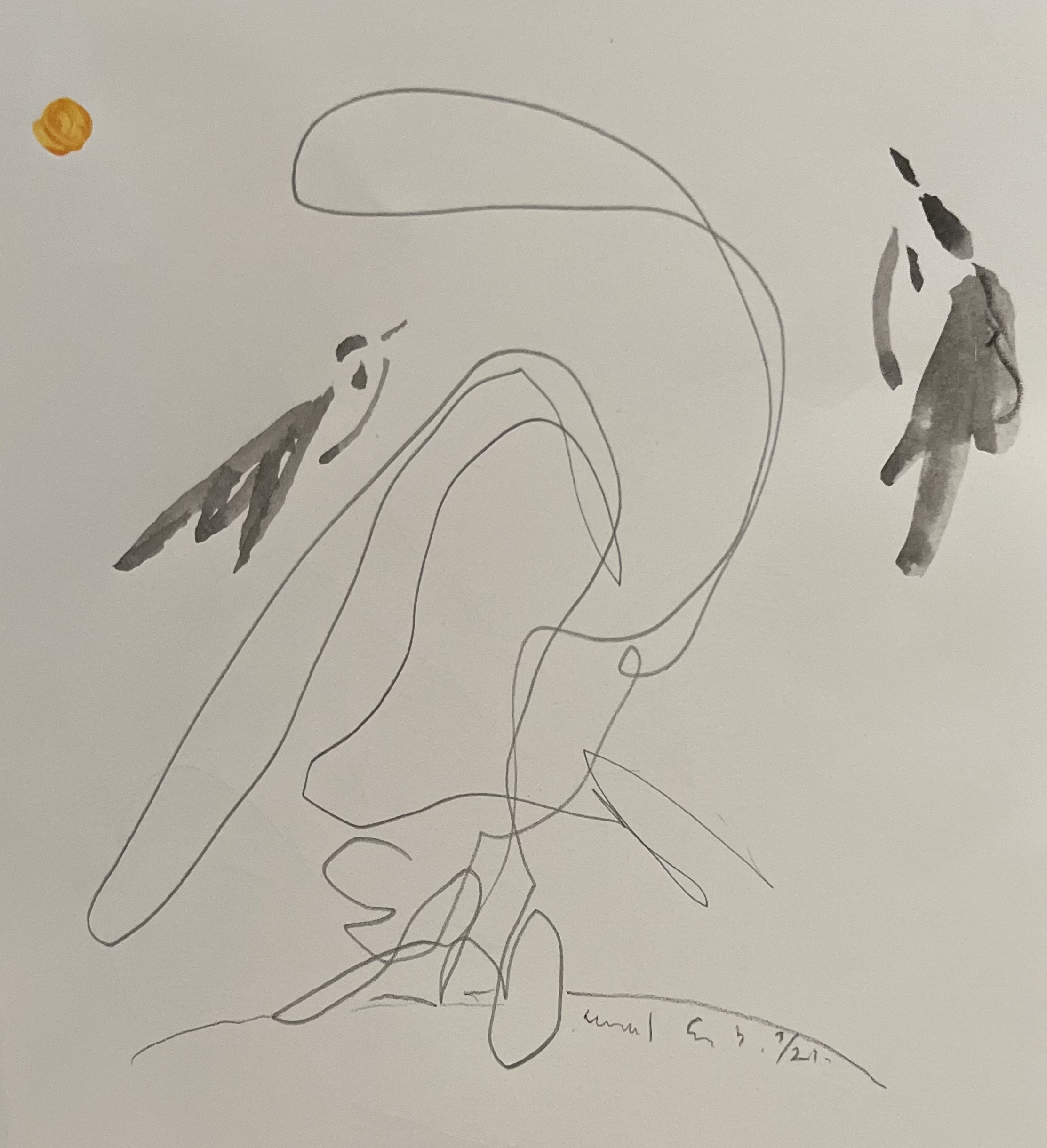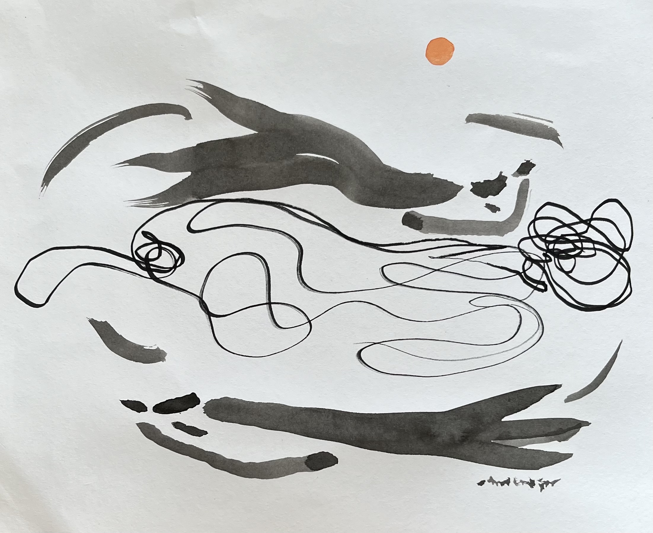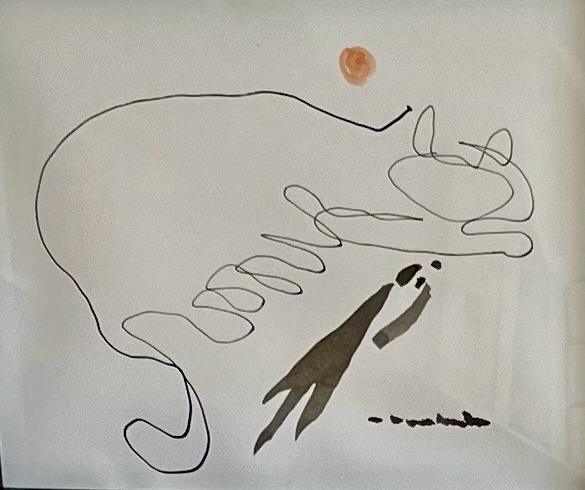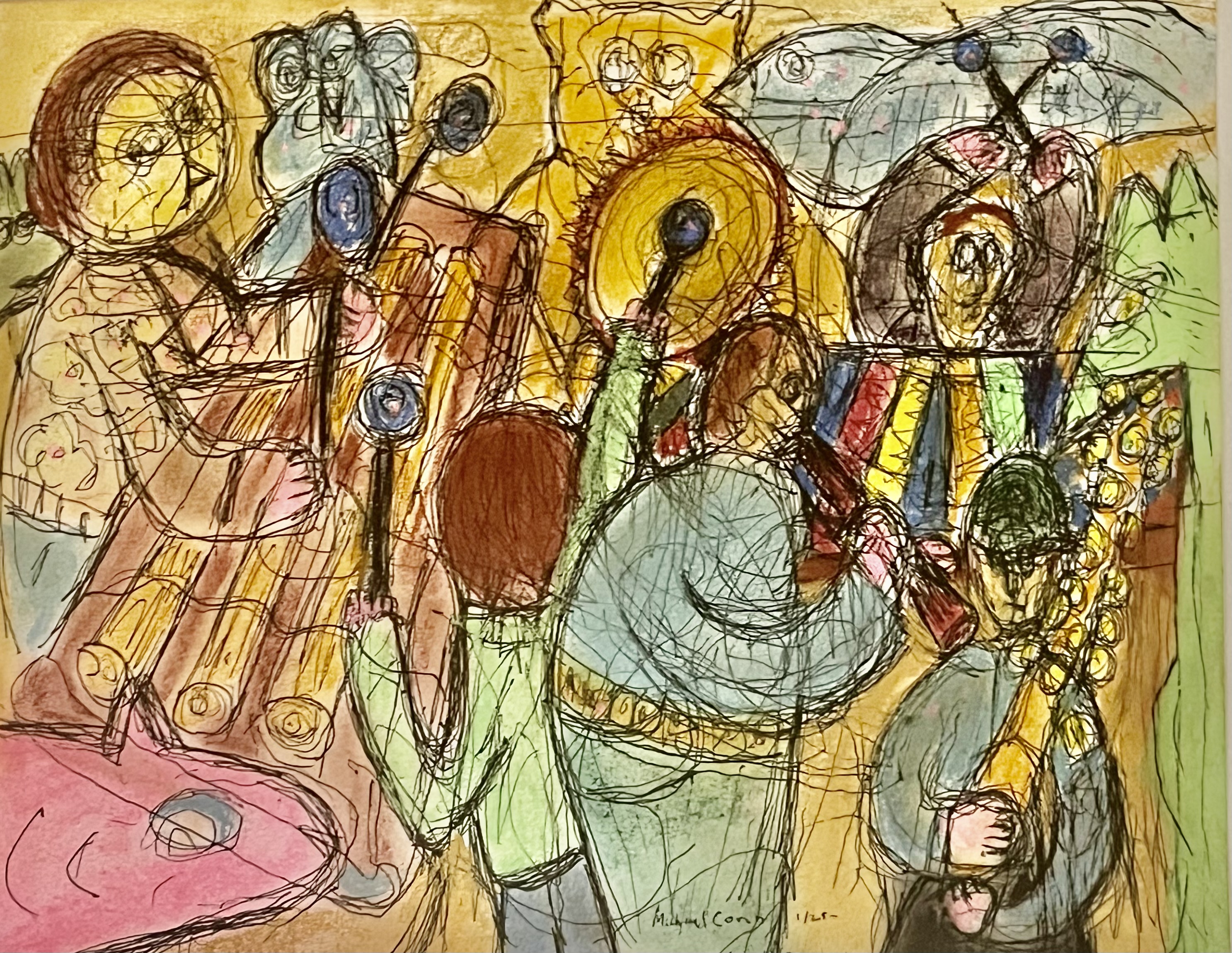 The instruments in this painting were drawn from small instruments in my music box. The characters were drawn from my imagination. I used a pen, then painted with watercolor, then used pen again. The all over chaotic lines complement the title of the story, “All Together Now”, taken from a Beatles’s song.