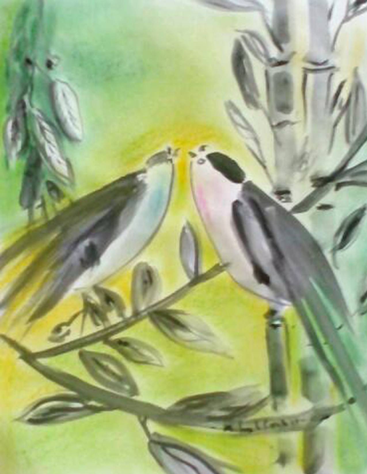 I recently painted an image of large and small swallows flying around a plum branch full of blossoms. I studied how to paint both the swallows and the blossoms in a book on Chinese Ink Painting. I usually create part of the image from life, but in this case, both parts were from a lesson. The colors also were borrowed, from a paint program on my computer. Nevertheless, after completing the image I was inspired to write a poem about it. The lesson about setting your own ego or desire to be in full color aside to support someone else is one that I have been learning recently.